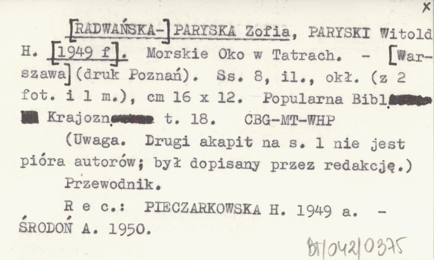 [RADWAŃSKA-]PARYSKA Zofia PARYSKI, Witold H. ; 1949 f Morskie Oko w Tatrach.