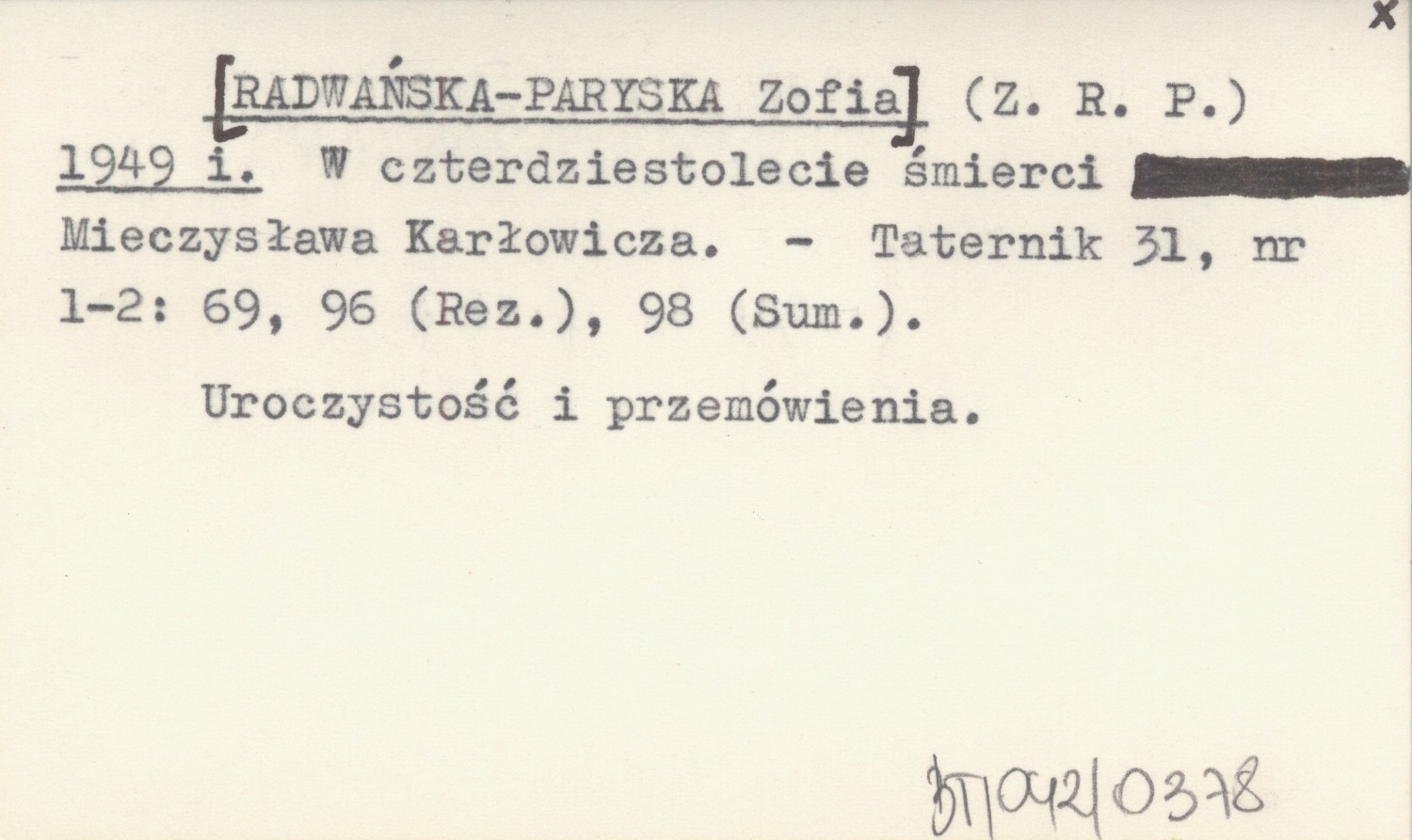 (Z. R. P.) [RADWAŃSKA-PARYSKA Zofia] 1949 i W czterdziestolecie śmierci Mieczysława Karłowicza.
