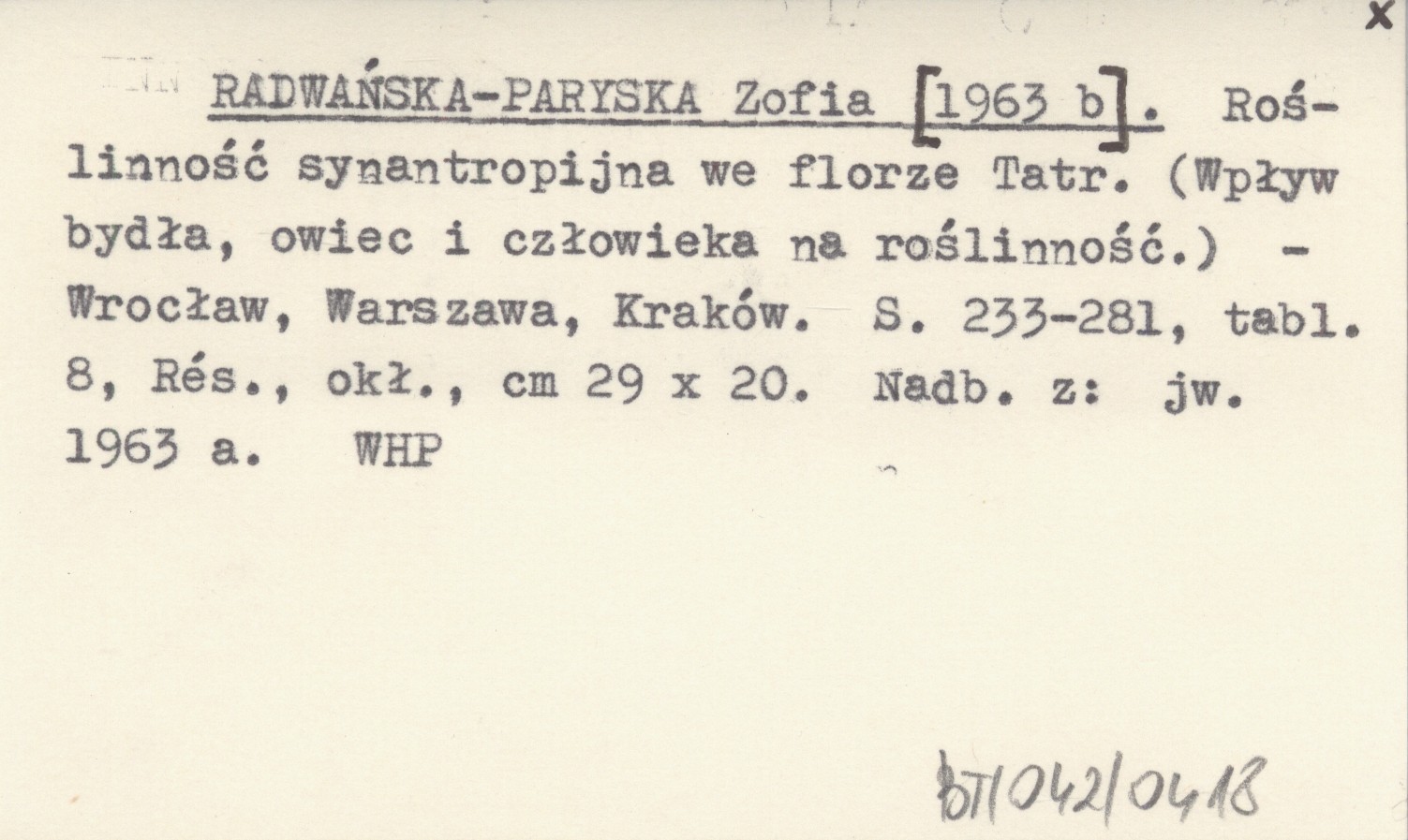 RADWAŃSKA-PARYSKA Zofia [1963 b] Roślinność synantropijna we florze Tatr. (Wpływ bydła, owiec i człowieka na roślinność).