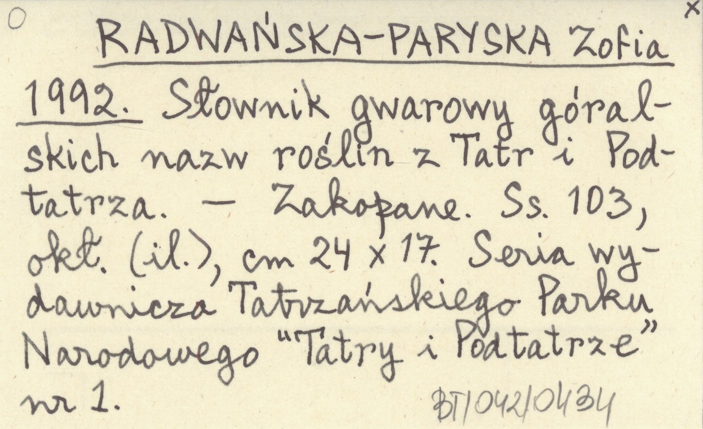 RADWAŃSKA-PARYSKA Zofia 1992 Słownik gwarowy góralskich nazw roślin z Tatr i Podtatrza.