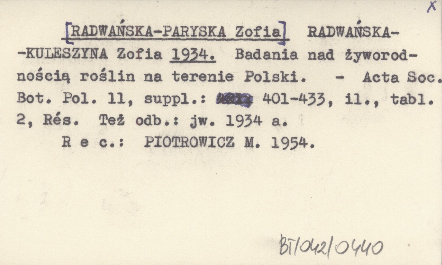 RADWAŃSKA-KULESZYNA Zofia [RADWAŃSKA-PARYSKA Zofia] 1934 Badania nad żyworodnością roślin na terenie Polski.