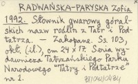 RADWAŃSKA-PARYSKA Zofia 1992 Słownik gwarowy góralskich nazw roślin z Tatr i Podtatrza.