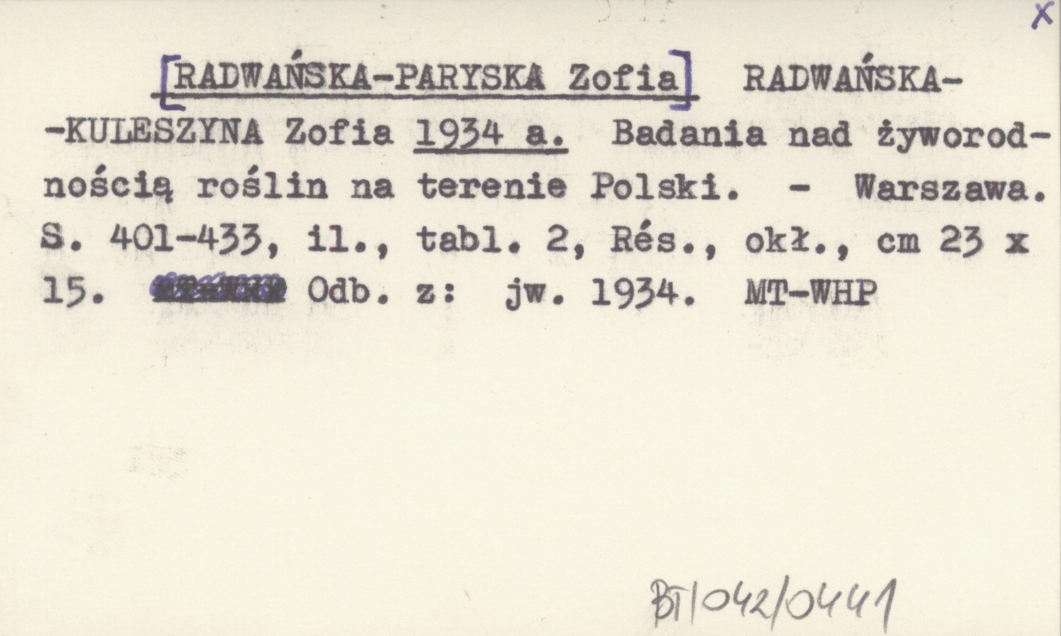 RADWAŃSKA-KULESZYNA Zofia [RADWAŃSKA-PARYSKA Zofia] 1934 a Badania nad żyworodnością roślin na terenie Polski.