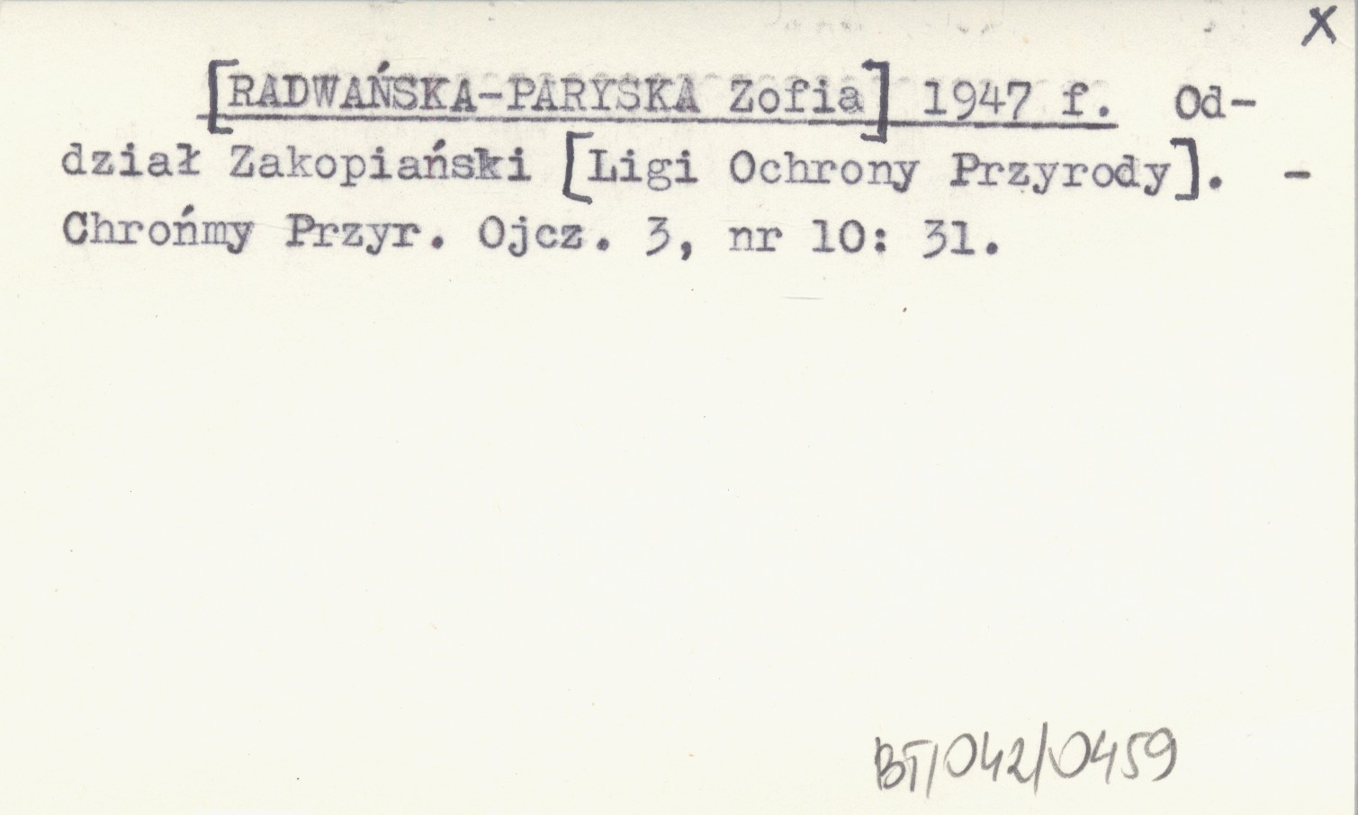 [RADWAŃSKA-PARYSKA Zofia] 1947 f Oddział Zakopiański [Ligi Ochrony Przyrody].