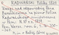 RADWAŃSKI Feliks 1820 Uwagi nad odpowiedzią Pana Barankiewicza na pismo Felixa Radwańskiego umieszczone w Pam: N. 10 r.z. 1819.