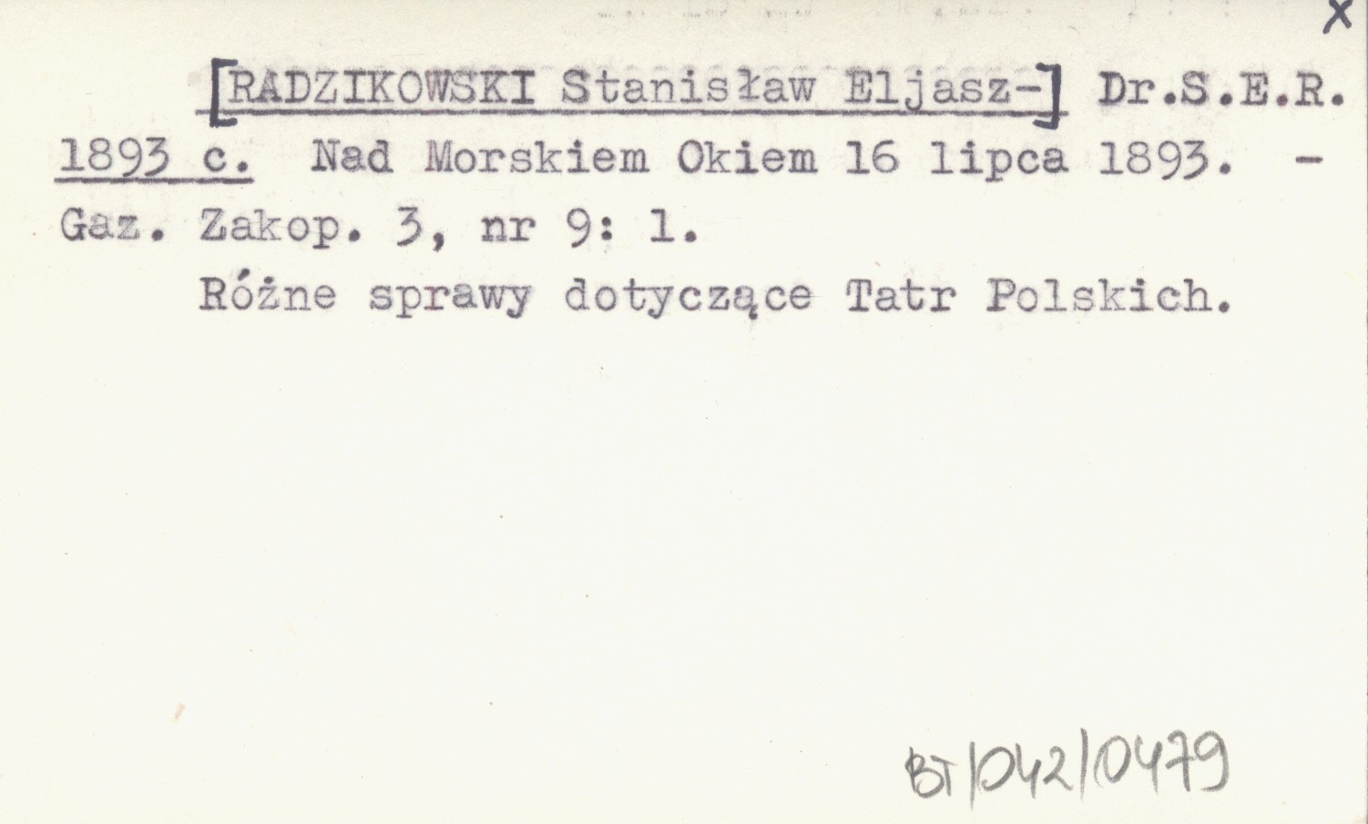 Dr. S. E. R. [RADZIKOWSKI Stanisław Eljasz-] 1893 c Nad Morskiem Okiem 16 lipca 1893.