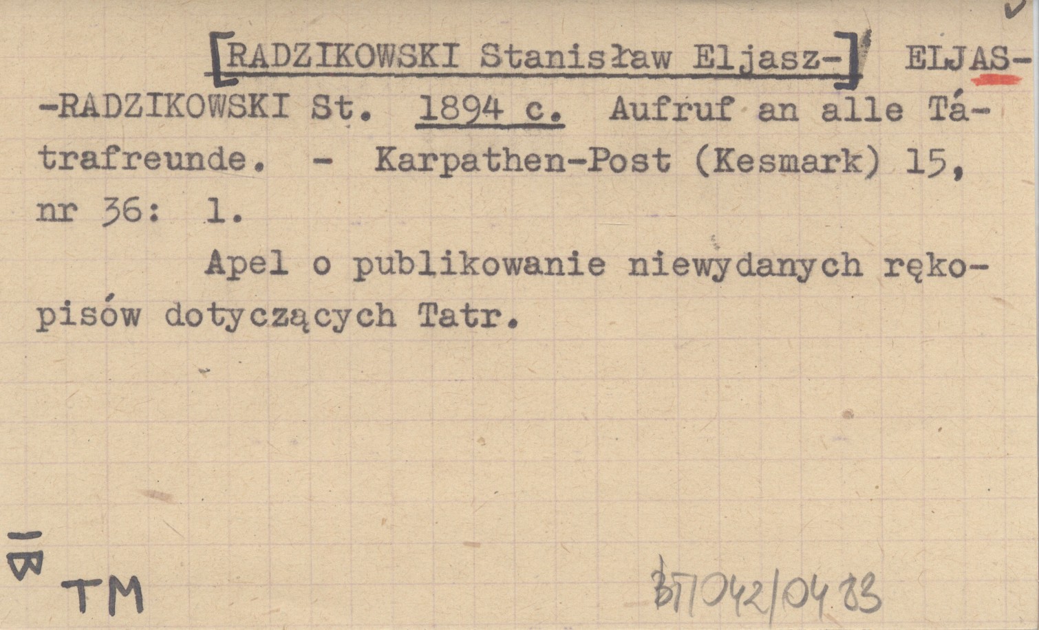 ELJAS-RADZIKOWSKI St. [RADZIKOWSKI Stanisław Eljasz-] 1894 c Aufruf an alle Tátrafreunde.