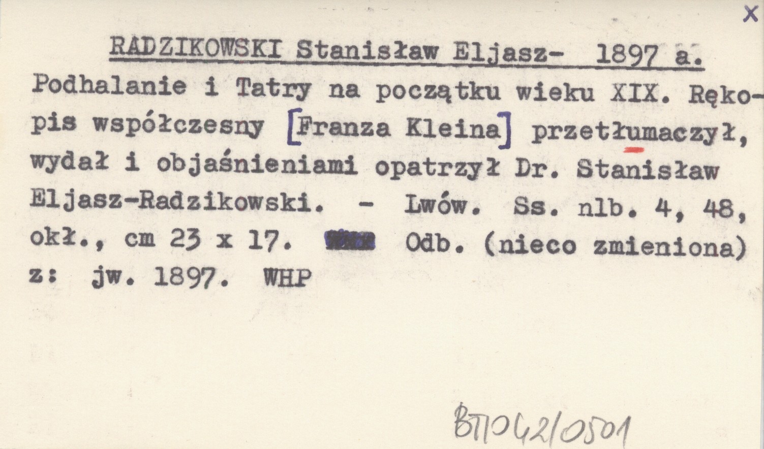 RADZIKOWSKI Stanisław Eljasz- 1897 a Podhalanie i Tatry na początku wieku XIX. Rękopis współczesny [Franza Kleina] przetłumaczył, wydał i objaśnieniami opatrzył Dr. Stanisław Eljasz-Radzikowski.