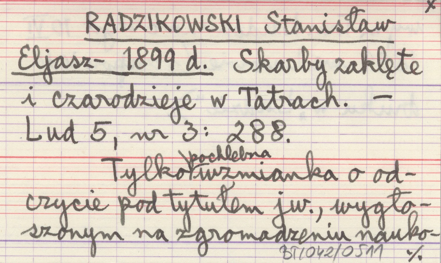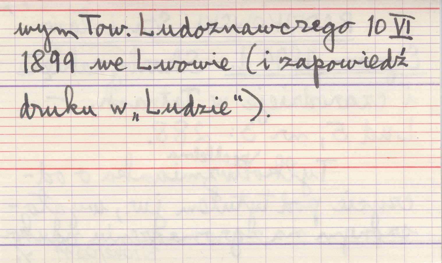 Lud, 5, nr 3: 288. Tylko pochlebna wzmianka o odczycie pod tytułem jw., wygłoszonym na zgromadzeniu naukowym Towarzystwa Ludoznawczego 10 VI 1899 we Lwowie (i zapowiedź druku w "Ludzie").