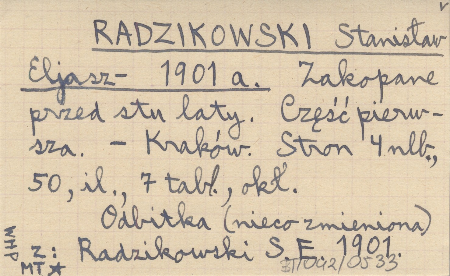 Kraków , [4], 50 s., il., 7 k., okł. Odbitka (nieco zmieniona) z: RADZIKOWSKI S. E. 1901.
