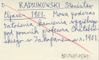 RADZIKOWSKI Stanisław Eljasz- 1901 Mowa podczas założenia kamienia węgielnego pod pomnik profesora Chałubińskiego w Zakopanem w r. 1901.
