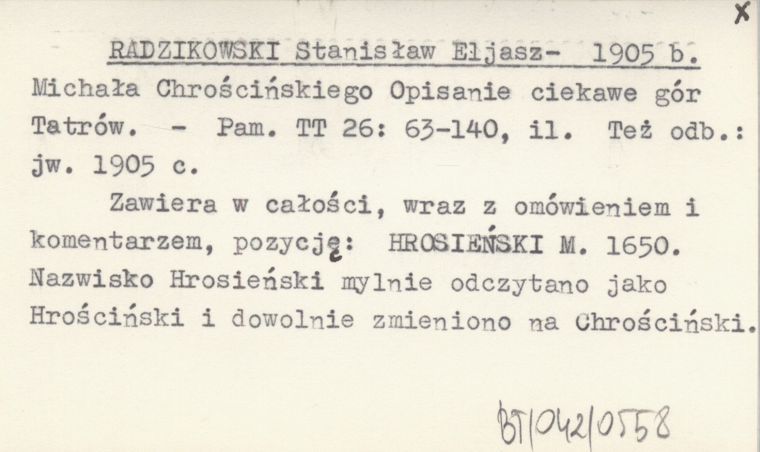 Pamiętnik Towarzystwa Tatrzańskiego, 26: 63-140, il. Zawiera w całości, wraz z omówieniem i komentarzem, pozycję: HROSIEŃSKI M. 1650. Nazwisko Hrosieński mylnie odczytano jako Hrościński i dowolnie zmieniono na Chrościński. Też odb.: jw. 1905 c. REC: ŚWIERZ M. 1913 ; PAWLIKOWSKI J. G. 1934 ; KRZYŻANOWSKI Julian 1934, 1935 ;