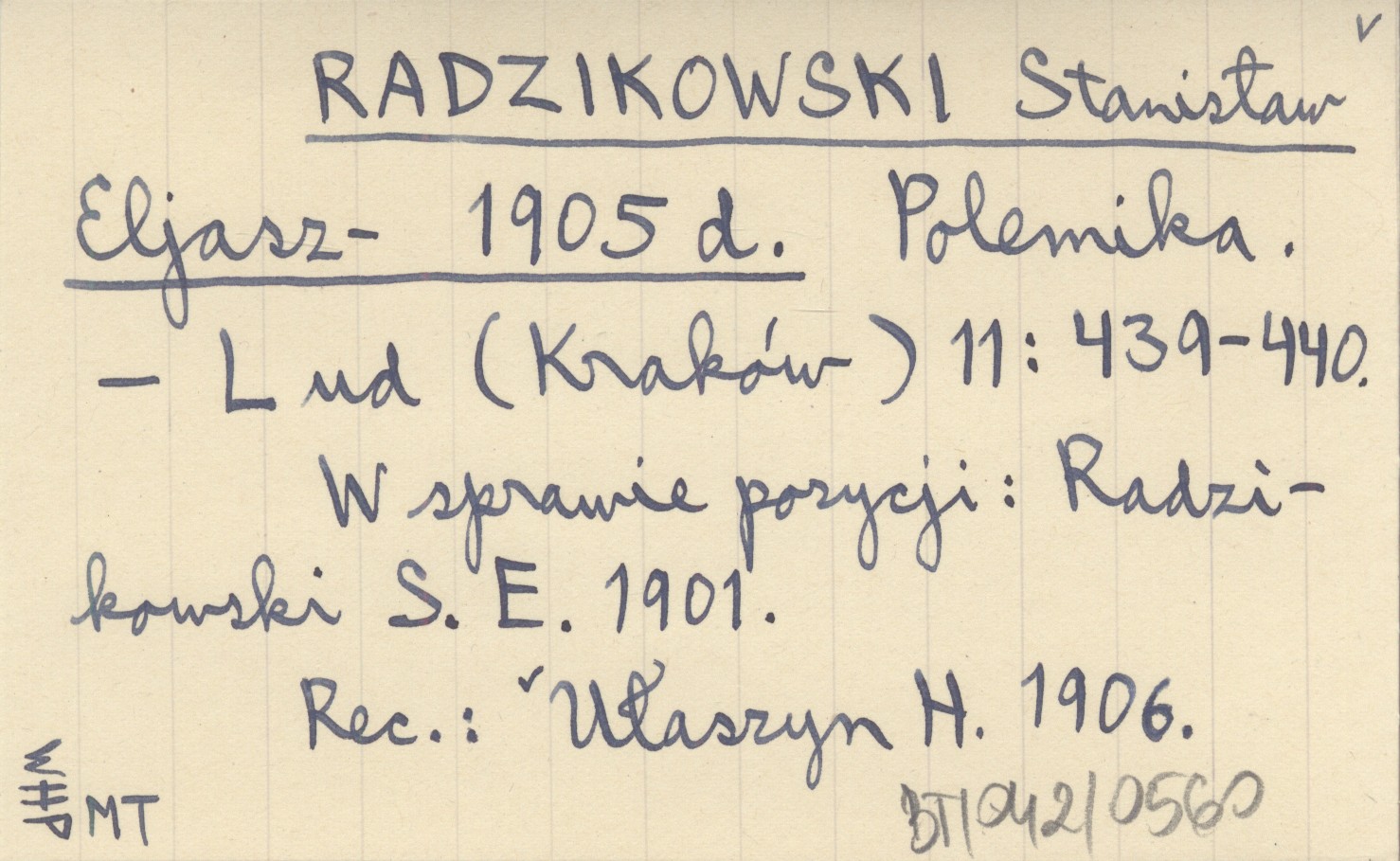 Lud (Kraków) , 11: 439-440. W sprawie pozycji: RADZIKOWSKI S. E. 1901. REC: UŁASZYN H. 1906