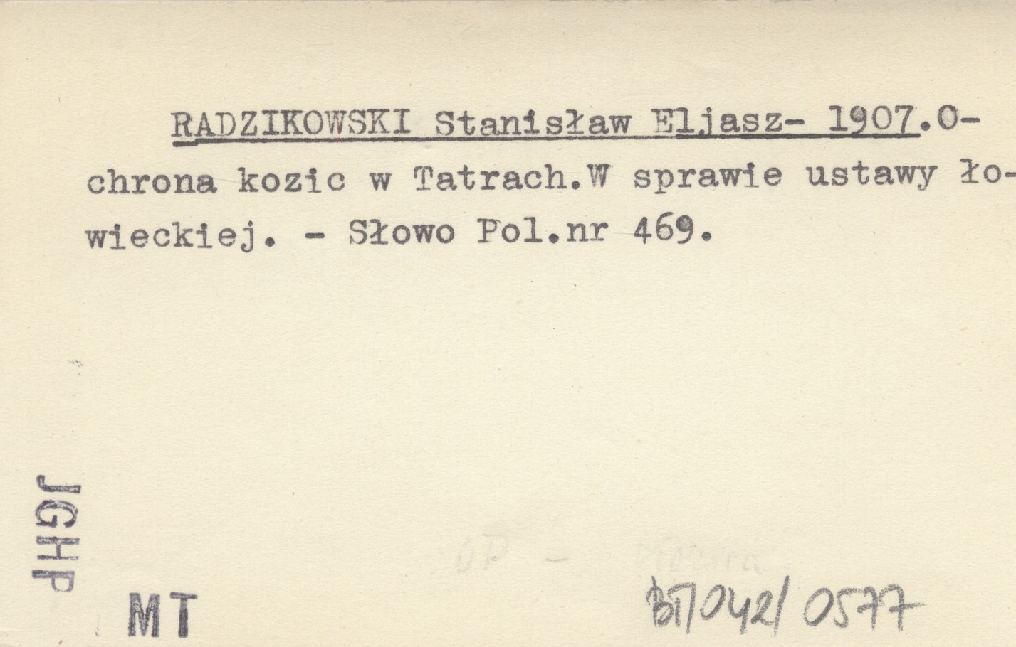 RADZIKOWSKI Stanisław Eljasz- 1907 Ochrona kozic w Tatrach. W sprawie ustawy łowieckiej.