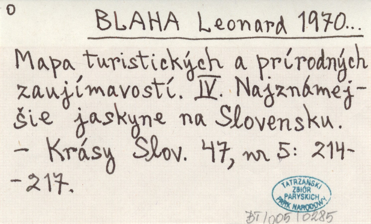 BLAHA Leonard 1970... Mapa turistickęch a prírodnęch zaujímavostí. IV. Najznámejčie jaskyne na Slovensku.
