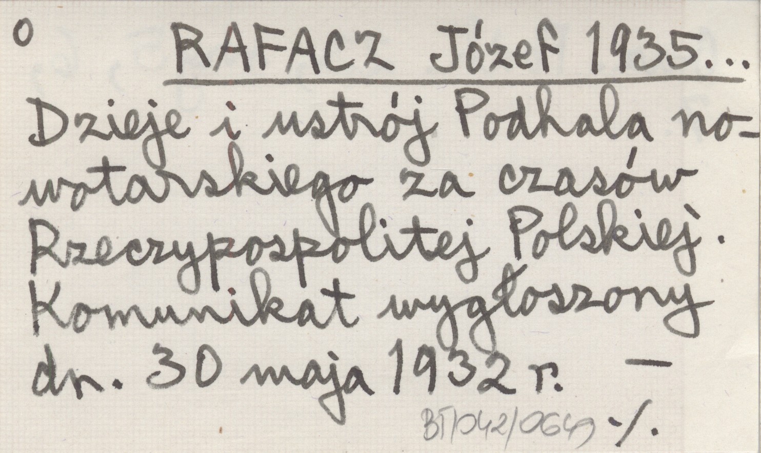 RAFACZ Józef 1935... Dzieje i ustrój Podhala nowotarskiego za czasów Rzeczypospolitej Polskiej. Komunikat wygłoszony dn. 30 maja 1932 r.