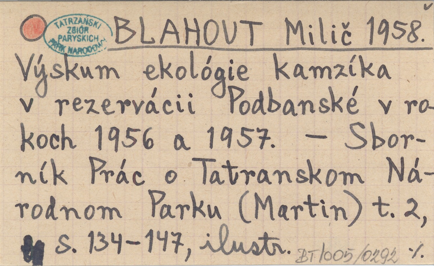 BLAHOUT Milič 1958 Výskum ekológie kamzíka v rezervácii Podbanské v rokoch 1956 a 1957.