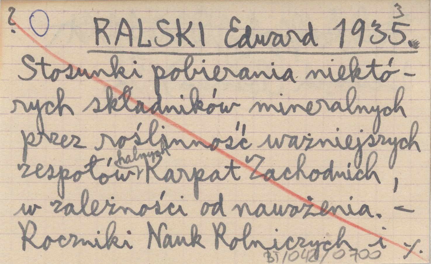 RALSKI Edward 1935 Stosunki pobierania niektórych składników mineralnych przez roślinność ważniejszych zespołów halnych Karpat Zachodnich, w zależności od nawożenia.