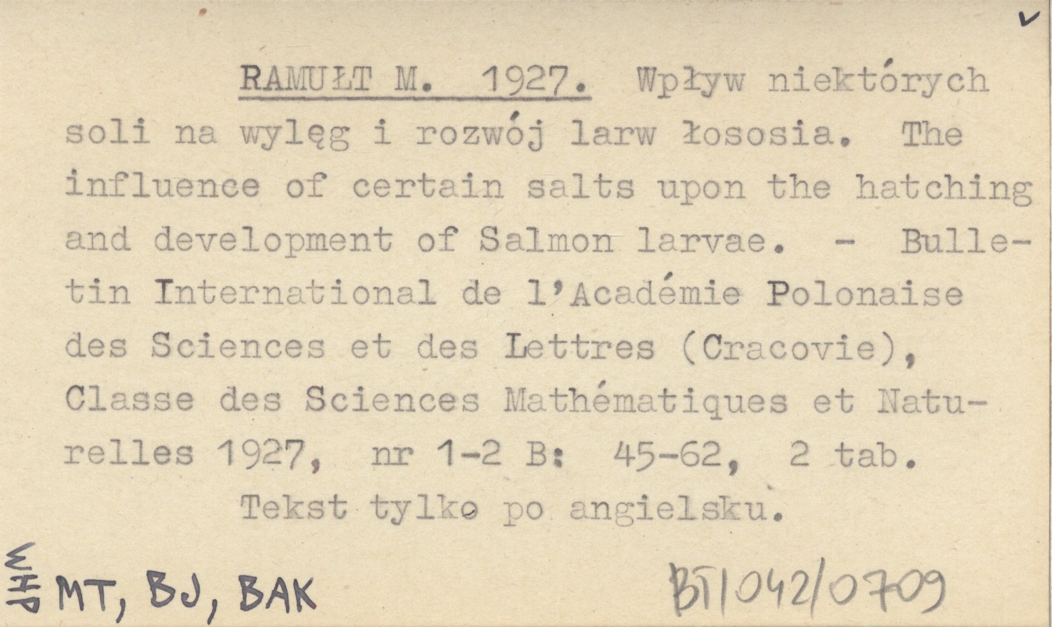 RAMUŁT M. 1927 Wpływ niektórych soli na wylęg i rozwój larw łososia. The influence of certain salts upon the hatching and dvelopment of Salmon larvae.