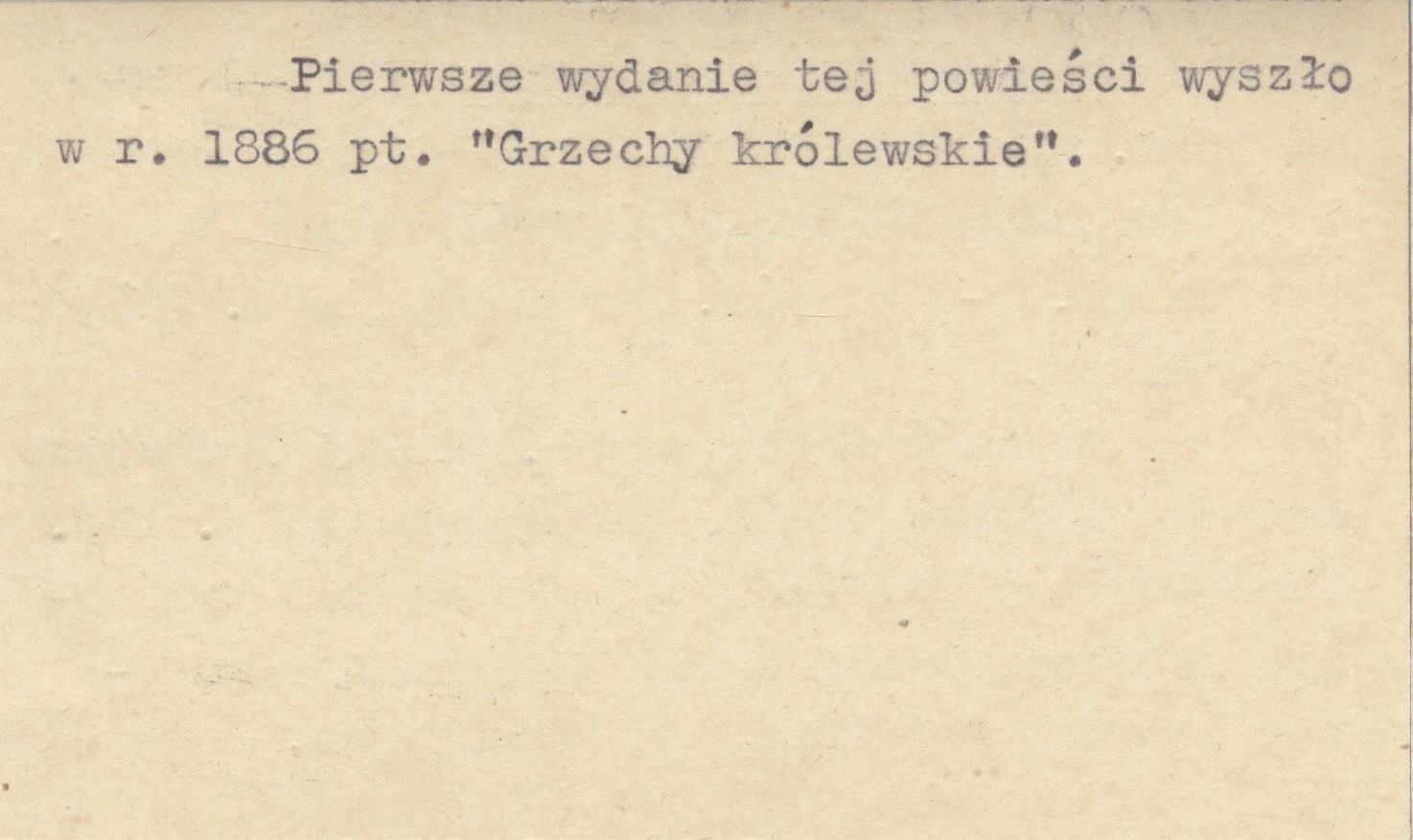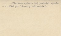 Kraków , 287 s., okł. (?), 14x21 cm. Powieść historyczna. Tatr i Podtatrza dotyczy końcowa część, poczynając od s. 163. Tom pierwszy (stron 176), wydany pod tym samym tytułem, w tym samym miejscu i roku - nie dotyczy ani Tatr, ani Podtatrza. Pierwsze wydanie tej powieści wyszło w r. 1886 pt. "Grzechy królewskie".