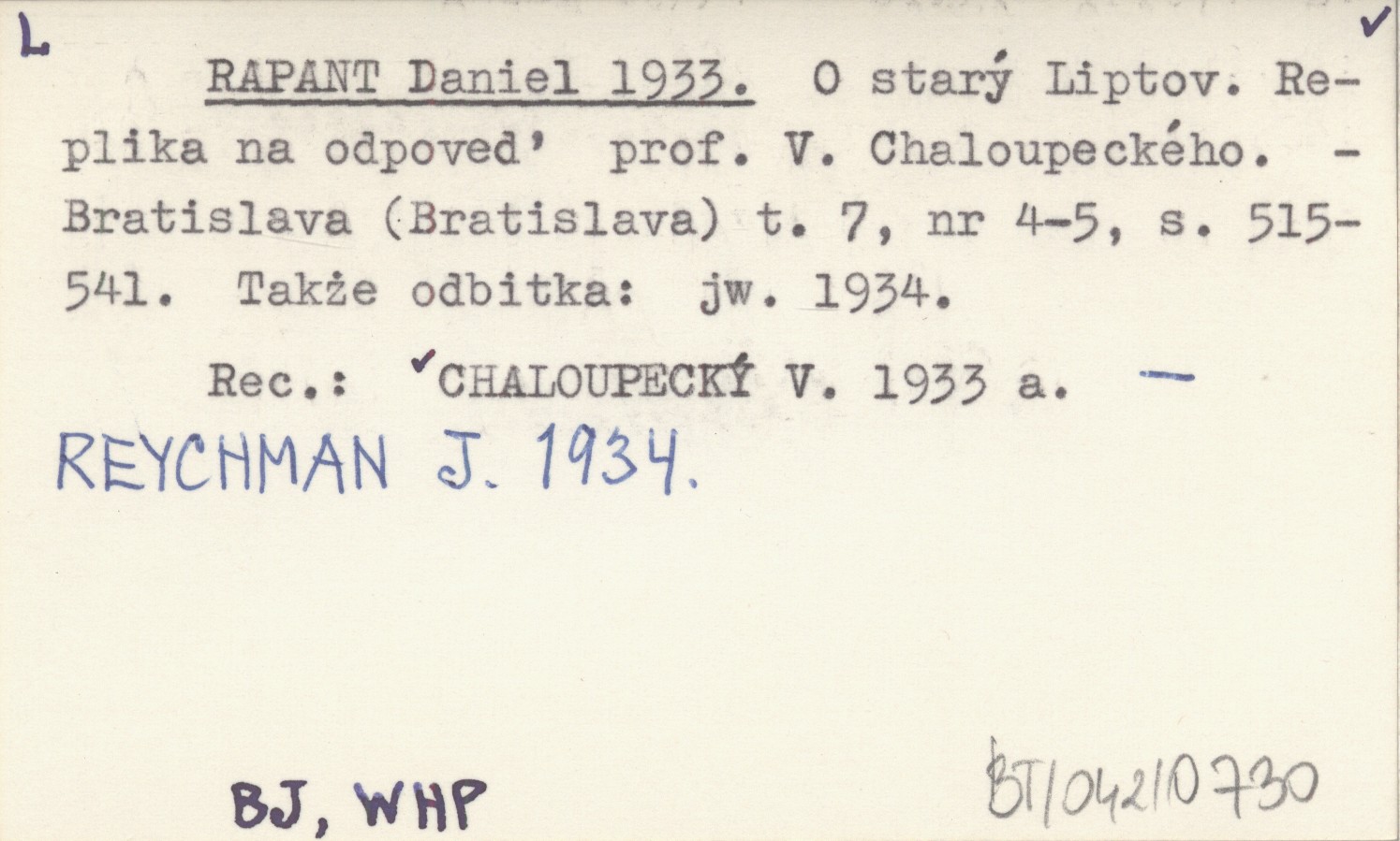 Bratislava (Bratislava) , T. 7, nr 4-5: 515-541. Także odbitka: jw. 1934 REC: CHALOUPECKÝ V. 1933 a ; REYCHMAN J. 1934 ;