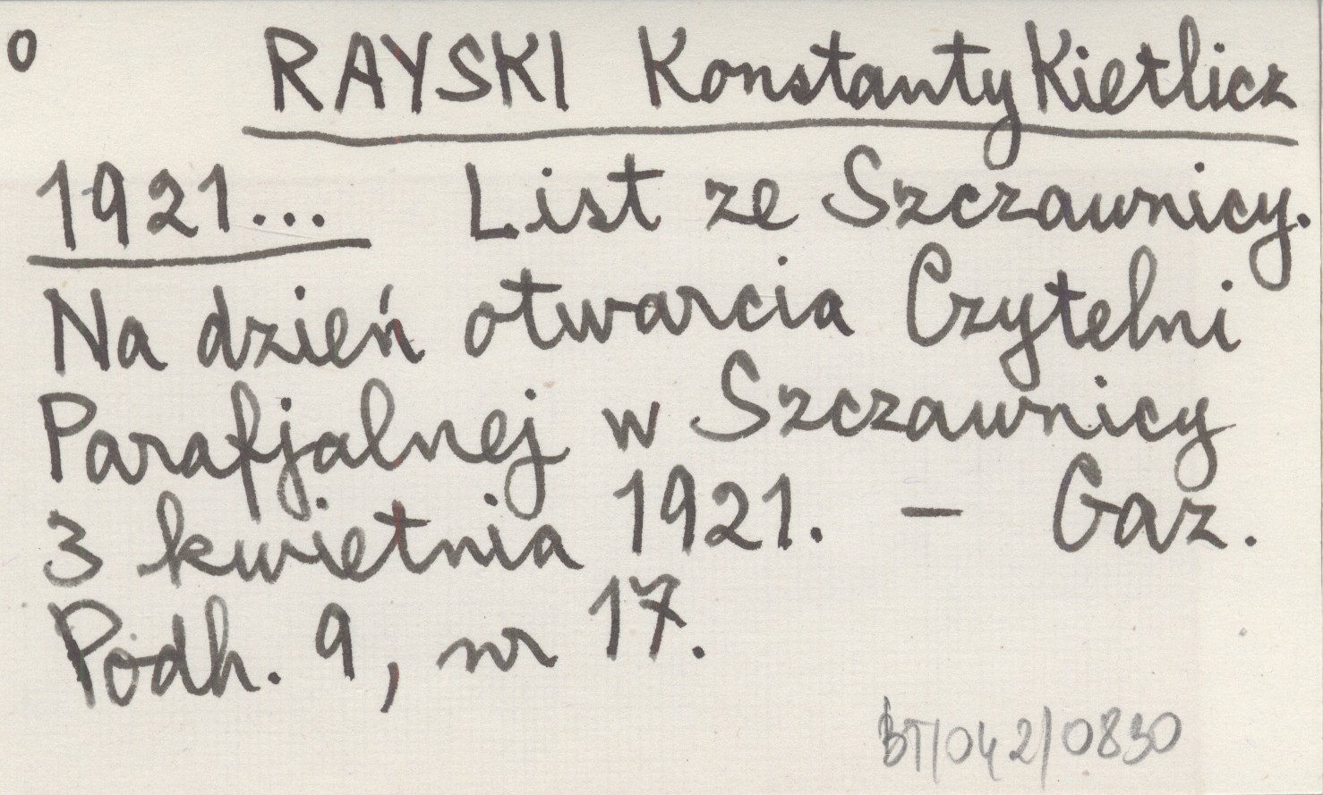 RAYSKI Konstanty Kietlicz 1921... List ze Szczawnicy. Na dzień otwarcia Czytelni Parafjalnej w Szczawnicy 3 kwietnia 1921.