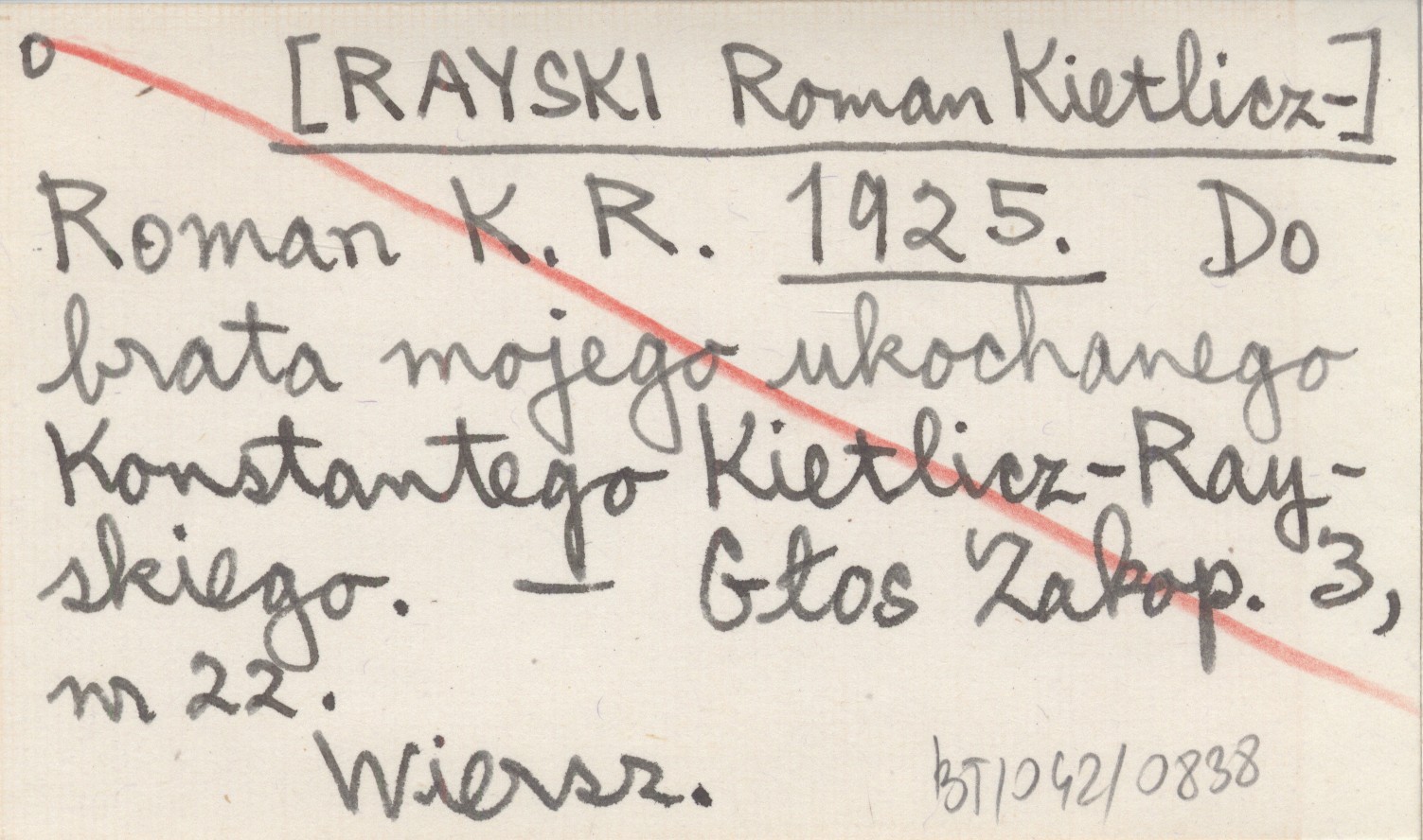 Roman K. R. [RAYSKI Roman Kietlicz-] 1925 Do brata mojego ukochanego Konstantego Kietlicz-Rayskiego.