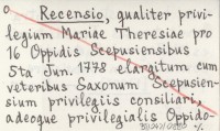 Recensio, qualiter privilegium Mariae Theresiae pro 16 Oppidis Scepusiensibus 5ta Jun. 1778 elargitum cum veteribus Saxonum Scepusiensium privilegiis consiliari, a deoque privilegialis Oppidorum horum status cit:tra Comitatensis Jurisdictionis es[?] Regnani Systematis convulsionem subsistere possit. [1790?]