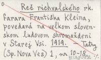 Reč richvalského rk. farara Františka Kleina, povedaná na velkom slovenskom ludovom shromaždeni v Starej Vsi. 1919