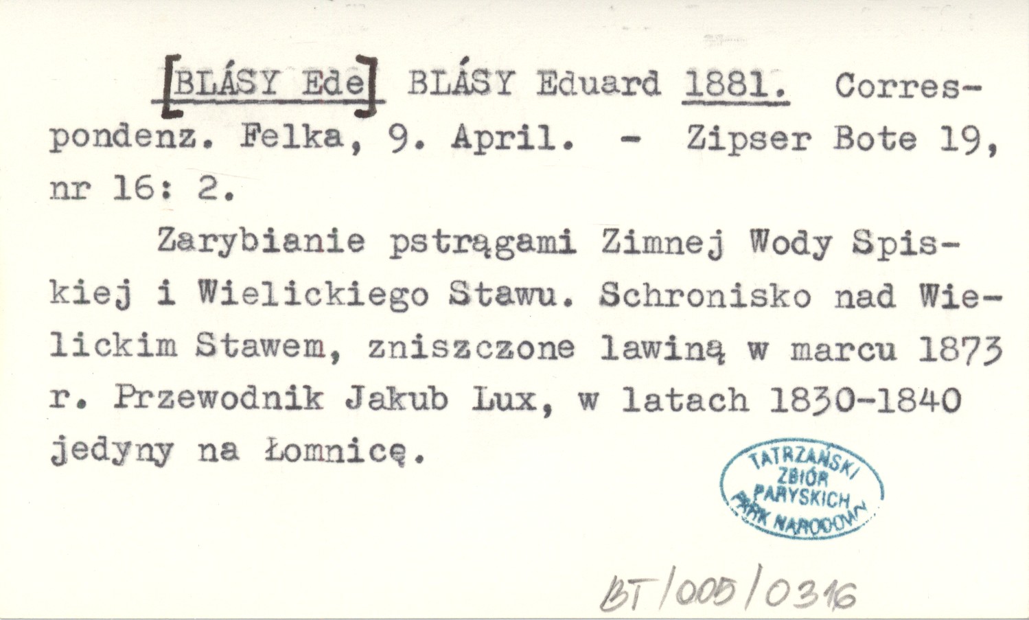 Zipser Bote, 19, nr 16: 2. Zarybianie pstrągami Zimnej Wody Spiskiej i Wielickiego Stawu. Schronisko nad Wielickim Stawem, zniszczone lawiną w marcu 1873 r. Przewodnik Jakub Lux, w latach 1830-1840 jedyny na Łomnicę.