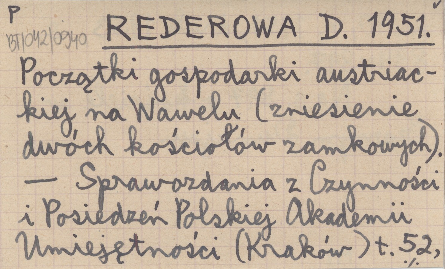 REDEROWA D. 1951 Początki gospodarki austriackiej na Wawelu (zniesienie dwóch kościołów zamkowych).