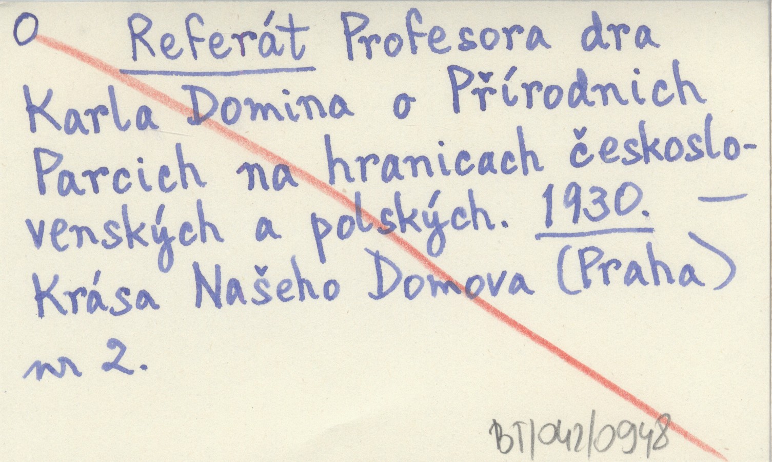 Referát Profesora dra Karla Domina o Pűírodnich Parcich na hranicach èeskoslovenskęch a polskęch. 1930