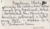 Regulamin Służby górniczej dla robotników zatrudnionych przy Kopalniach, Hutach i Warsztatach Pani Klementyny Homolacz, położonych w Zakopany. 1862