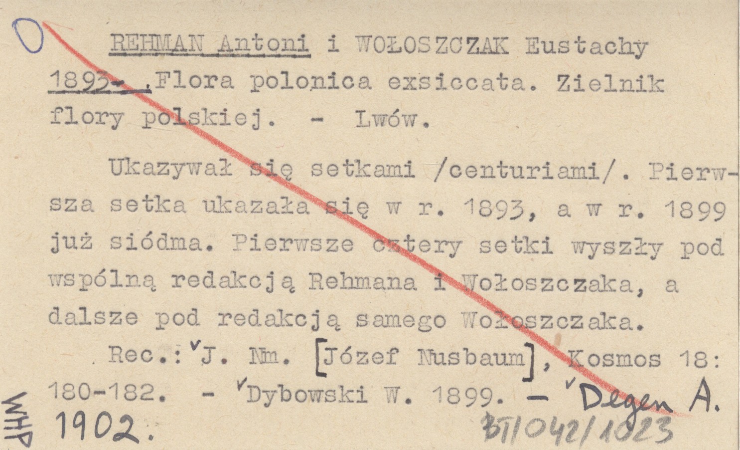 Lwów , Ukazywał się setkami (centuriami). Pierwsza setka ukazała się w r. 1893, a w r. 1899 już siódma. Pierwsze cztery setki wyszły pod wspólną redakcją Rehmana i Wołoszczaka, a dalsze pod redakcją samego Wołoszczaka. REC: J. Nm. [Józef NUSBAUM], Kosmos 18: 180-182 ; DYBOWSKI W. 1899 ; DEGEN A. 1902 ;
