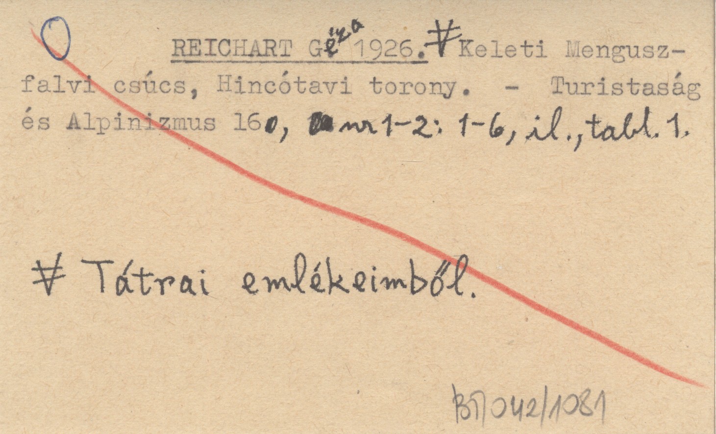 REICHART Géza 1926 Tátrai emlékeimbõl. Keleti Menguszfalvi csúcs, Hincótavi torony.