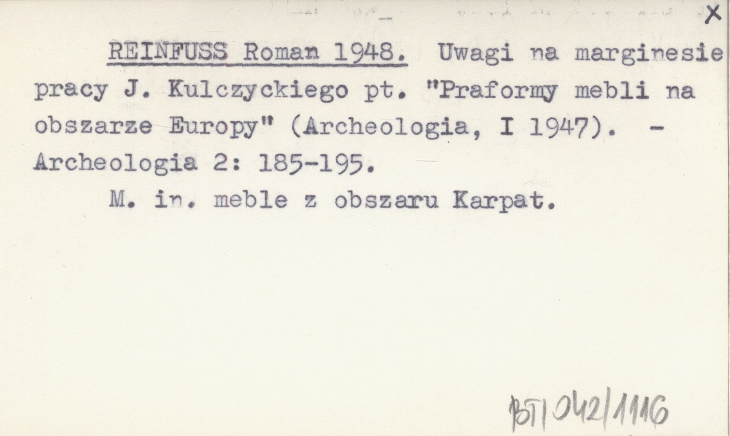 REINFUSS Roman 1948 Uwagi na marginesie pracy J. Kulczyckiego pt. "Praformy mebli na obszarze Europy" (Archeologia, I 1947).