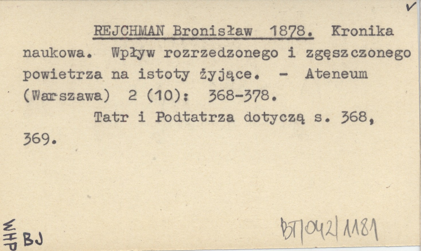 REJCHMAN Bronisław 1878 Kronika naukowa. Wpływ rozrzedzonego i zgęszczonego powietrza na istoty żyjące.