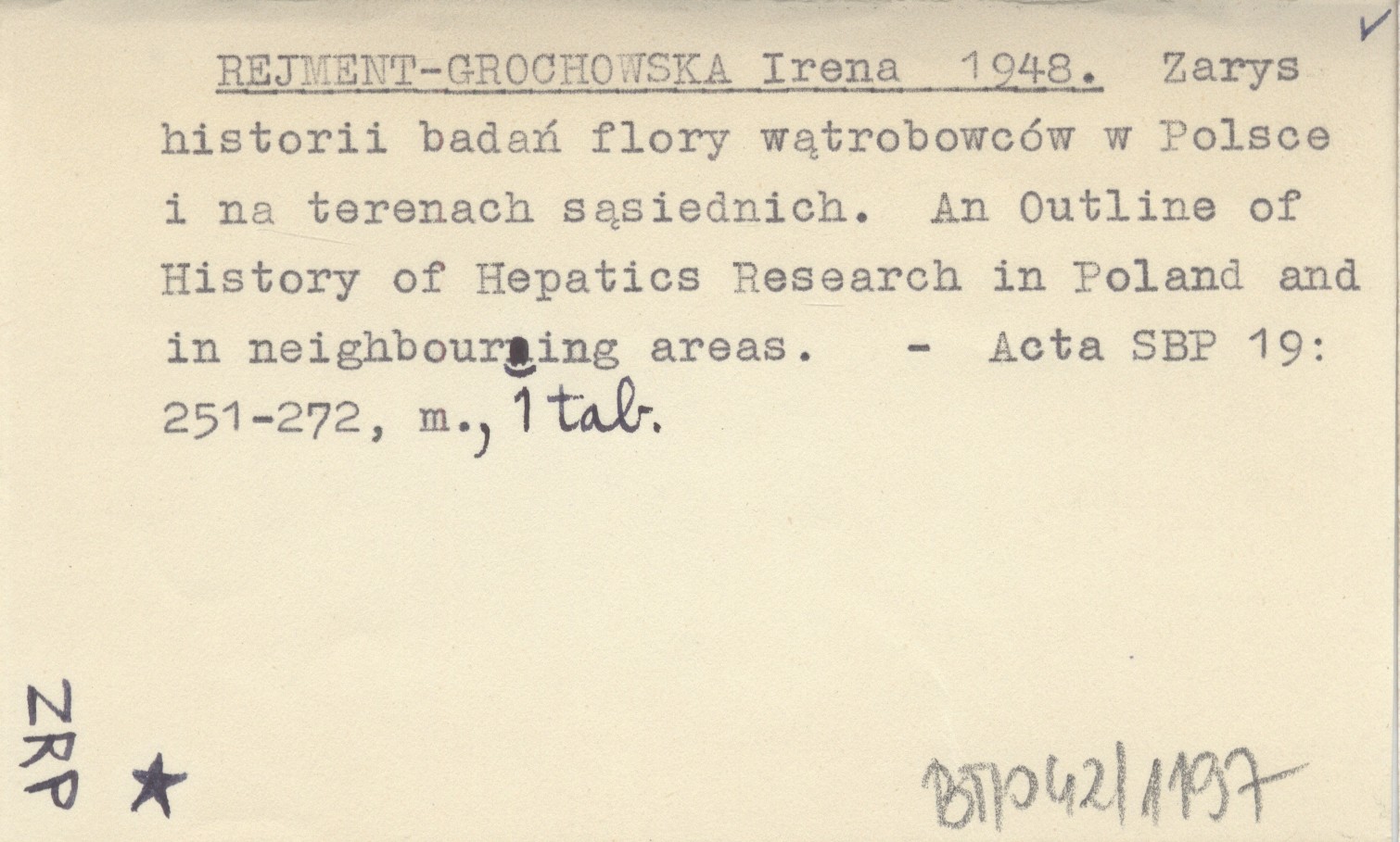 REJMENT-GROCHOWSKA Irena 1948 Zarys historii badań flory wątrobowców w Polsce i na terenach sąsiednich. An Outline of History of Hepatics Research in Poland and in neighbouring areas.