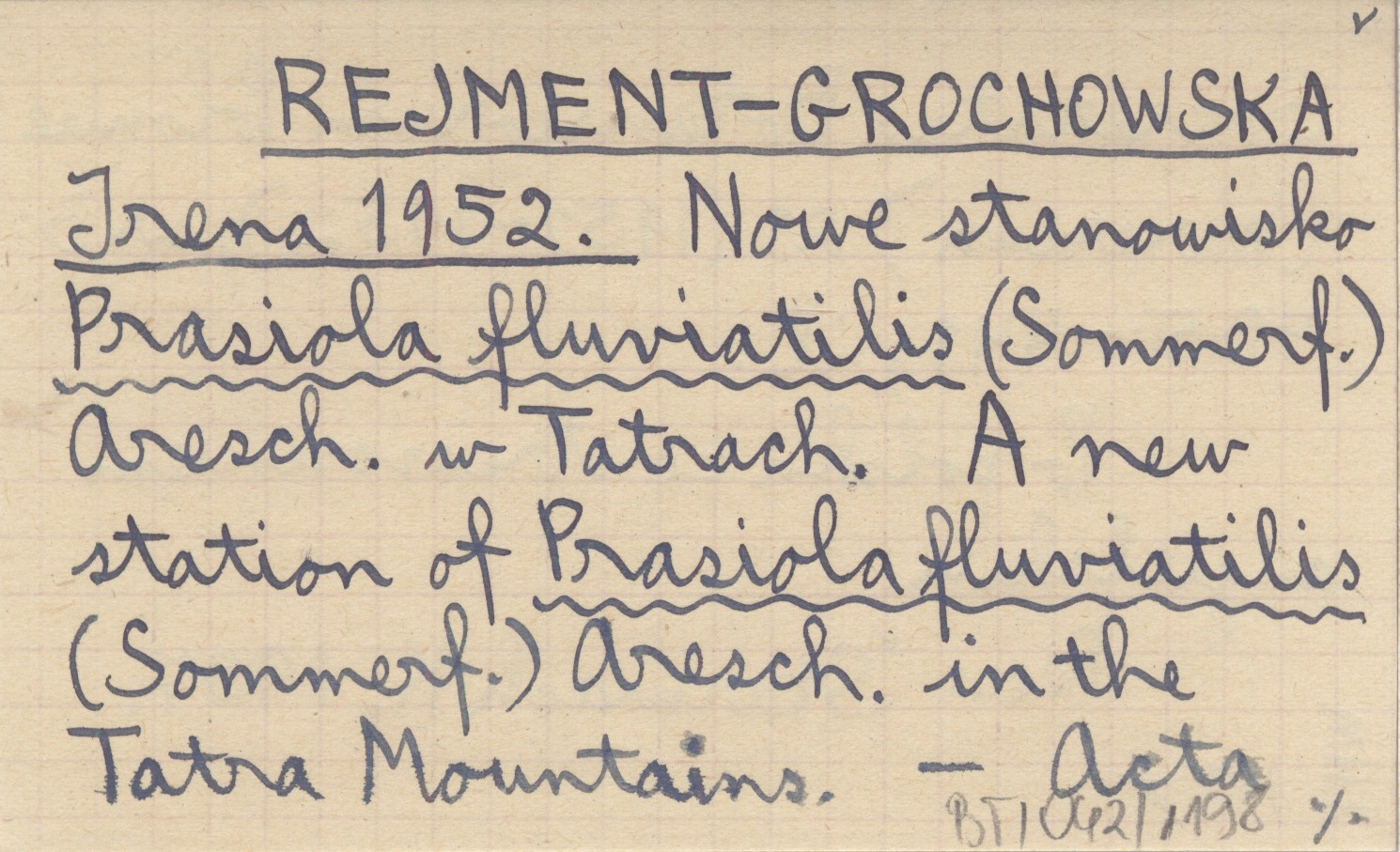 REJMENT-GROCHOWSKA Irena 1952 Nowe stanowisko Prasiola fluviatilis (Sommerf.) Aresch. w Tatrach. A new station of Prasiola fluviatilis (Sommerf.) Aresch. in the Tatra Mountains.