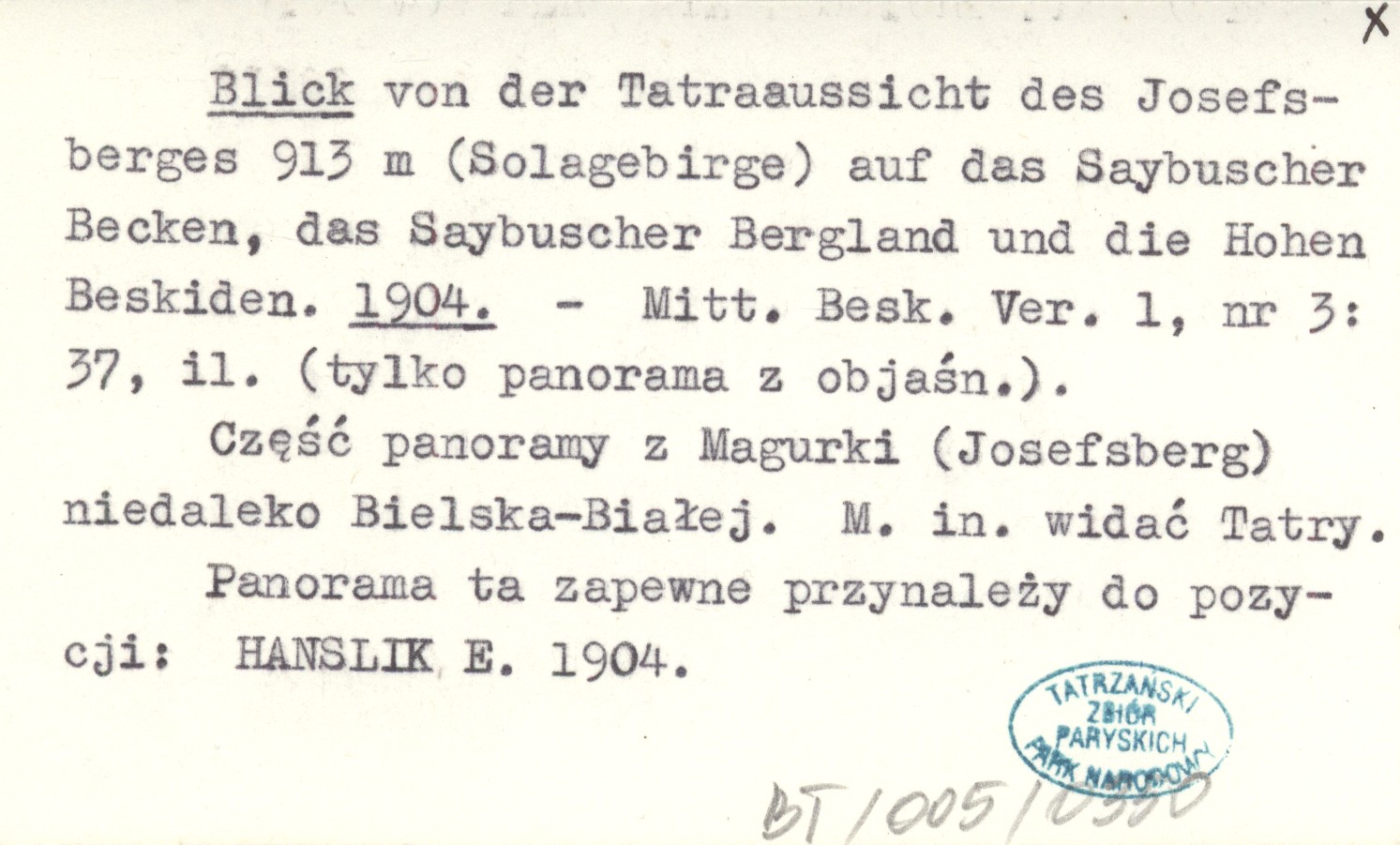 Mitt. Besk. Ver., 1, nr 3: 37, il. (tylko panorama z objaśn.). Część panoramy z Magurki (Josefsberg) niedaleko Bielska-Białej. M. in. widać Tatry. Panorama ta zapewne przynależy do pozycji: HANSLIK E. 1904.