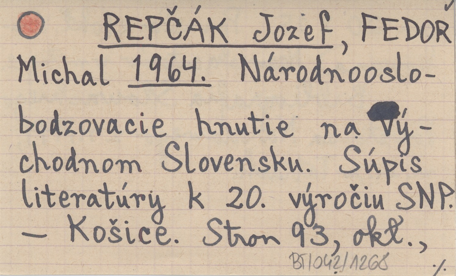 REPČÁK Jozef FEDOR, Michal. ; 1964 Národnooslobodzovacie hnutie na východnom Slovensku. Súpis literatúry k 20. výročiu SNP.