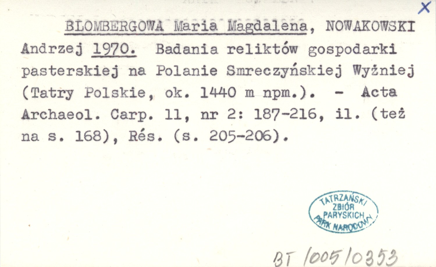 BLOMBERGOWA Maria Magdalena NOWAKOWSKI, Andrzej. ; 1970 Badania reliktów gospodarki pasterskiej na Polanie Smreczyńskiej Wyżnej (Tatry Polskie, ok. 1440 m npm.).