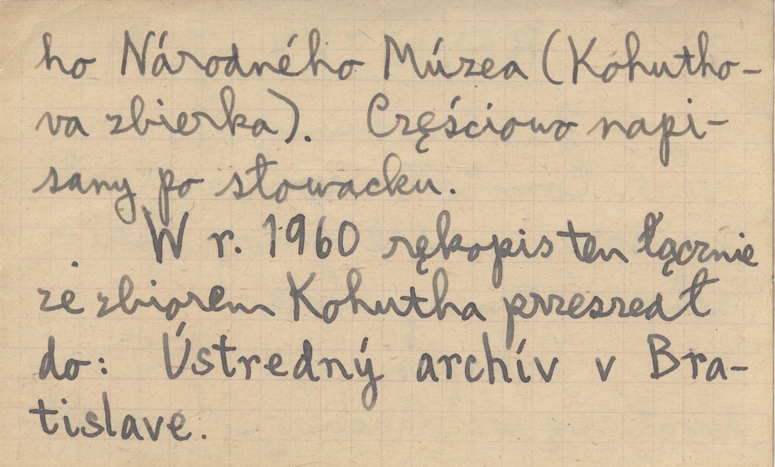 , Rękopis. W r. 1955 znajdował się w: Archív Slovenského Národného Múzea (Kohuthova zbierka). Częściowo napisany po słowacku. W r. 1960 rękopis ten łącznie ze zbiorem Kohutha przeszedł do: Ústredný archív v Bratislave.