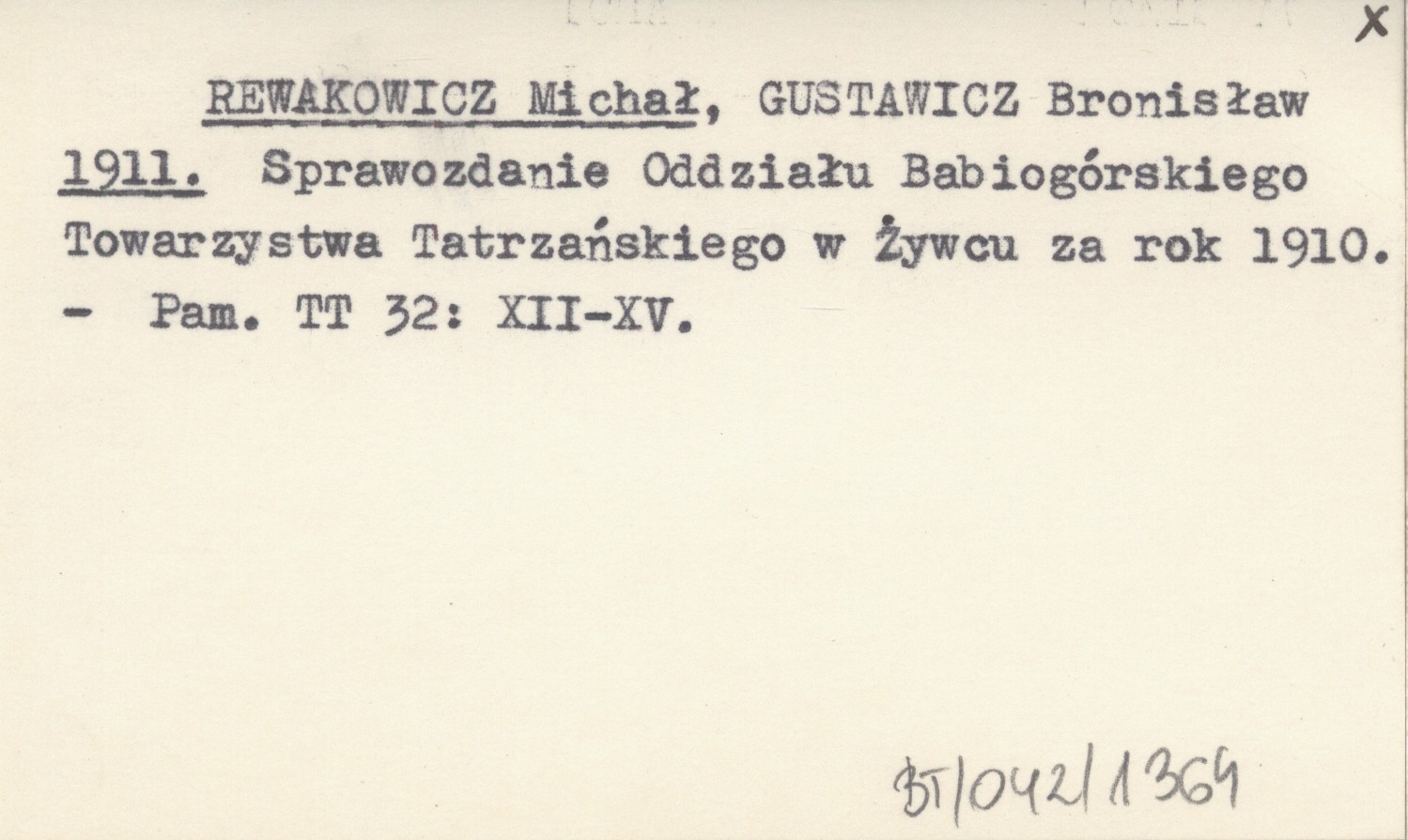 REWAKOWICZ Michał GUSTAWICZ, Bronisław. ; 1911 Sprawozdanie Oddziału Babiogórskiego Towarzystwa Tatrzańskiego w Żywcu za rok 1910.