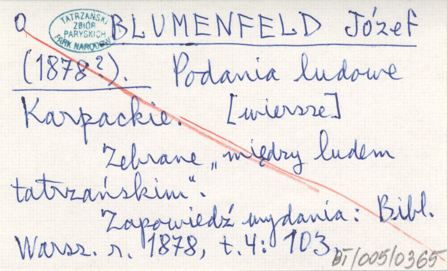 BLUMENFELD Józef (1878?) Podania ludowe Karpackie.