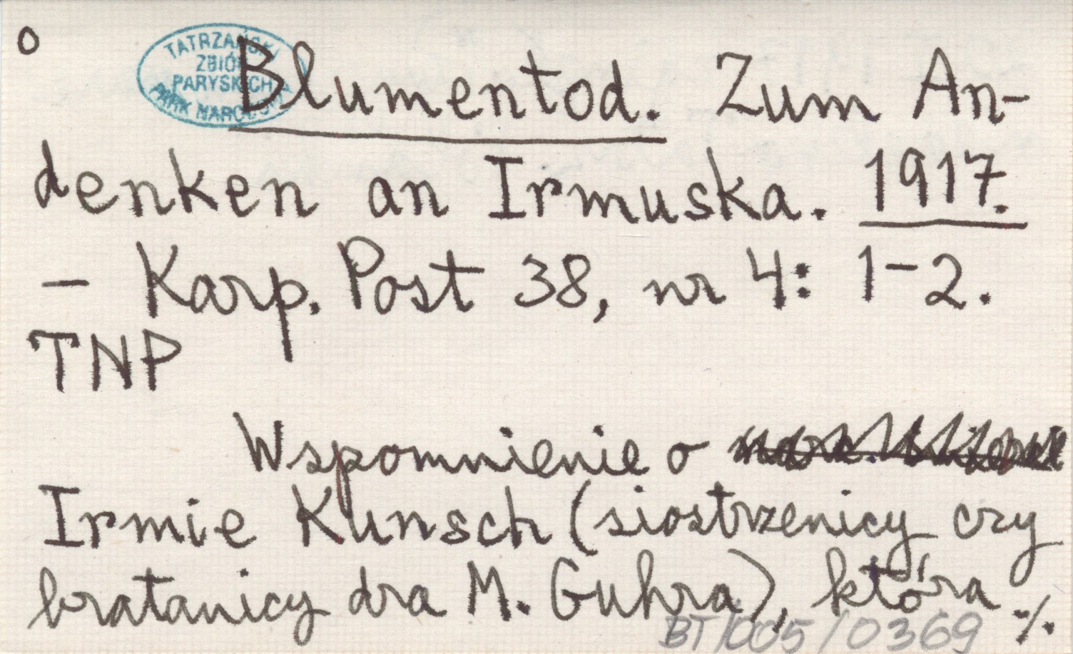 Karpathen-Post, 38, nr 4: 1-2. Wspomnienie o Irmie Kunsch (siostrzenicy czy bratanicy dra M. Guhra), która 20 I 1917 zginęła w wypadku narc. niedaleko Tatrz. Polanki.