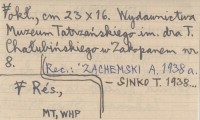 Zakopane (Wydawnictwa Muzeum Tatrzańskiego im. dra T. Chałubińskiego w Zakopanem, nr 8) , 95 s., il., Rés., okł., 23x16 cm. REC: ZACHEMSKI A. 1938 a ; SINKO T. 1938... ;