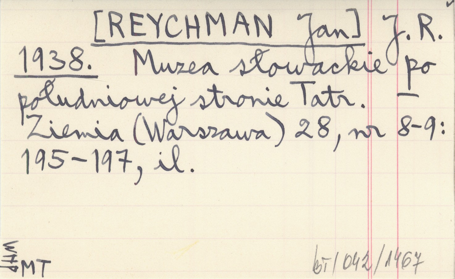 J. R. [REYCHMAN Jan] 1938 Muzea słowackie po południowej stronie Tatr.
