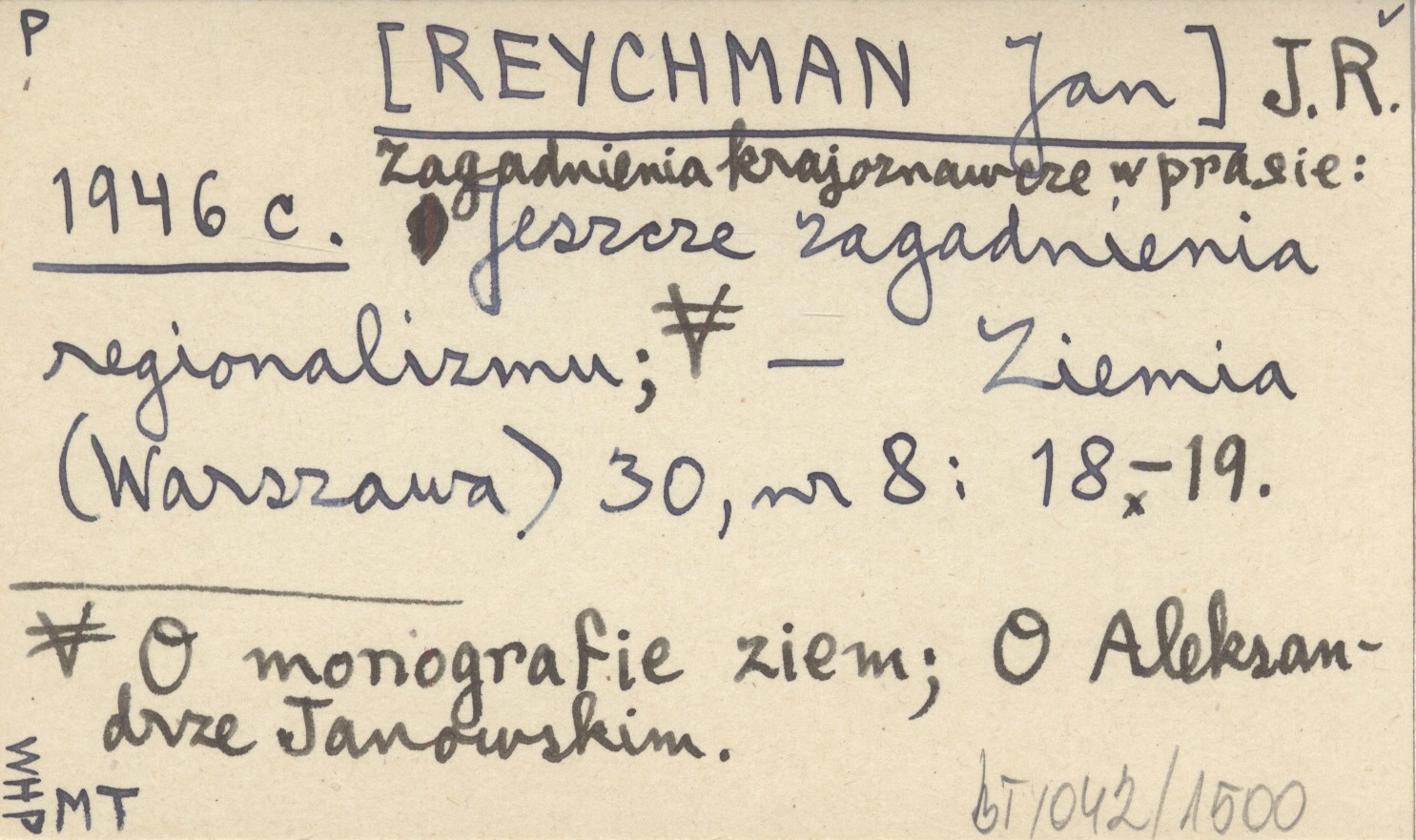 J. R. [REYCHMAN Jan] 1946 c Zagadnienia krajoznawcze w prasie: Jeszcze zagadnienia regionalizmu; O monografie ziem; O Aleksandrze Janowskim.