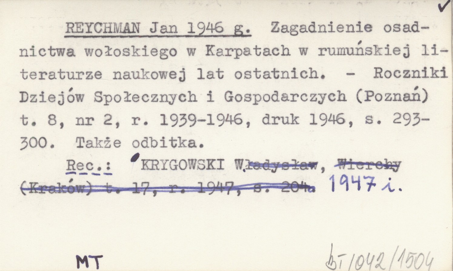 Roczniki Dziejów Społecznych i Gospodarczych (Poznań) , T. 8, nr 2, r. 1939-1946, druk 1946: 293-300. Także odbitka. REC: KRYGOWSKI W. 1947 i